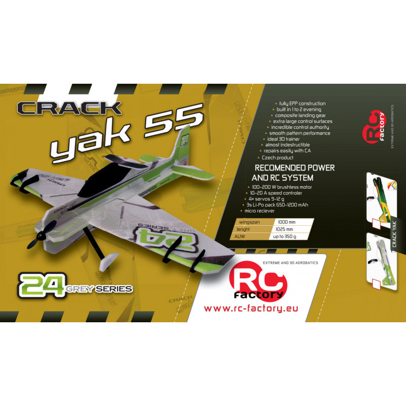 39palcový Crack Yak je upravený, dlouho očekávaný bratr známého modelu Crack Yak. Model je vyroben z EPP renomovanou českou firmou RC Factory a je přizpůsoben pro "agresivní" 3D akrobacii