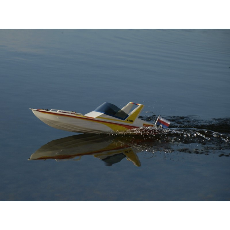 Stavebnice motorového člunu pro elektromotory řady 400. Rozsypový model s plastovým trupem a nástavbami PSH, hnací hřídelí, kormidlem a maketovým příslušenstvím.