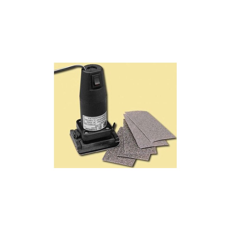 Miniaturní orbitální bruska německé firmy Hobby Drill, určená k přesnému broušení povrchů ze dřeva, kovu a plastu. Můžete použít všechny komerčně dostupné brusné listy se suchým zipem (vystřihnout formát 70x50 mm). Nástroj je určen především pro modelování.