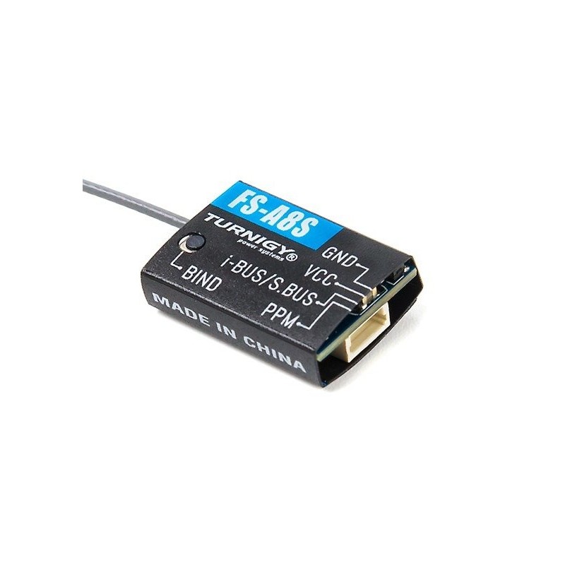 Ve světě dronů FPV je hmotnost a velikost komponent nesmírně důležitá. V této oblasti odvádí skvělou práci 8kanálový přijímač FS-A8S, který váží pouze 1,2 gs rozměry 20 x 14,5 x 3 mm. Jednosměrný přijímač navržený pro drony využívá extrémně stabilní protokol AFHDS 2A a podporuje standardní výstup PPM i i-BUS až do 18 kanálů. Dosah přijímače je až 300 metrů. Přijímač je kompatibilní s vysílači FS-i4, FS-i6, FS-i6S, FS-i6X, FS-i10, FS-GT2E, FS-GT2G, FS-GT2F a také s vysílači Turnigy, jako jsou TGY-i6s, Turnigy Evolution.