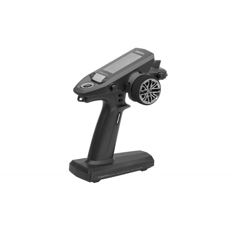 Vysílač T4PM v klasickém designu s rukojetí, která perfektně padne do ruky, je vybaven ovládacími prvky na volantu, plynovou rukojetí, dvěma tlačítkovými spínači, jedním voličem a pěti digitálními trimry (3 kolem řídítek, 2 na rukojeti). K programování slouží tři tlačítka a multifunkční joystick; snadnou orientaci v intuitivním menu zajišťuje velký podsvícený LCD displej. T4PM má paměť pro 40 modelů a širokou škálu pokročilých programovacích funkcí pro běžné i speciální modely aut - např. nezávislé ovládání a pohon (pomocí 2 ovladačů) předních a zadních kol pro pásy, dvouokruhové brzdy pro velké modely 1:5, gyroskop pro driftování, ABS, kontrola trakce, míchačka nádrží atd