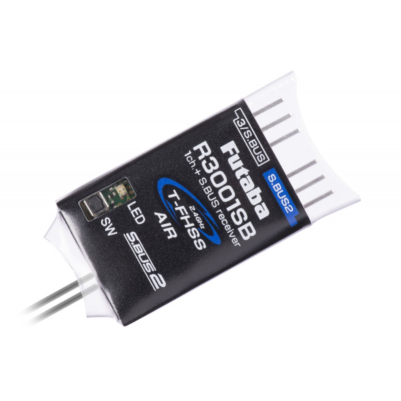 Malý a velmi lehký telemetrický přijímač vysílacího systému Futaba T-FHSS Air-2,4 GHz s dvojicí diverzitních antén s plným dosahem. Je určen především pro použití v dronech a dalších modelech využívajících řídicí jednotky komunikující prostřednictvím sběrnice S.BUS nebo S.BUS2; díky kompaktním rozměrům a velmi nízké hmotnosti je vhodný i pro malé modely letadel se servy S.BUS/S.BUS2. Volitelné kanálové režimy R3001SB poskytují jeden klasický výstup PWM kanálu (kanál 3) a výstup S.BUS2 nebo S.BUS a S.BUS2. Port S.BUS2 pro obousměrnou komunikaci umožňuje připojení serverů S.BUS2, telemetrických senzorů a dalších kompatibilních zařízení. Provozní stavy přijímače jsou indikovány LED diodou.