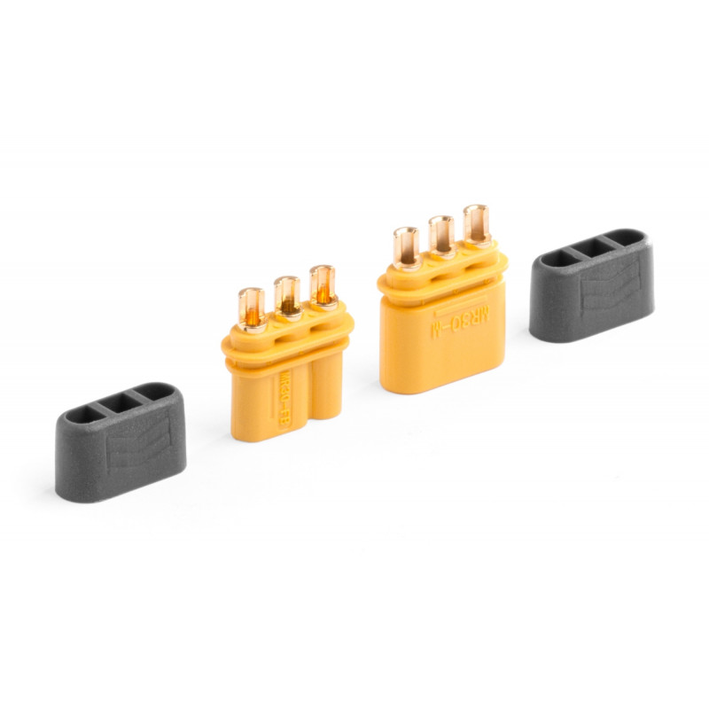 Sada tříkolíkových konektorů MR30 pro připojení třífázového motoru k řídicí jednotce.