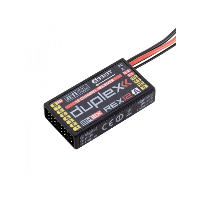 jeti REX 12A EPC 12kanálový přijímač s plným rozsahem s integrovaným stabilizačním systémem ASSIST, kompatibilní s protokoly Jeti EX a EX Bus. Přijímač podporuje telemetrické funkce a má vyvedený konektor (typ MPX) pro připojení externího napájení.