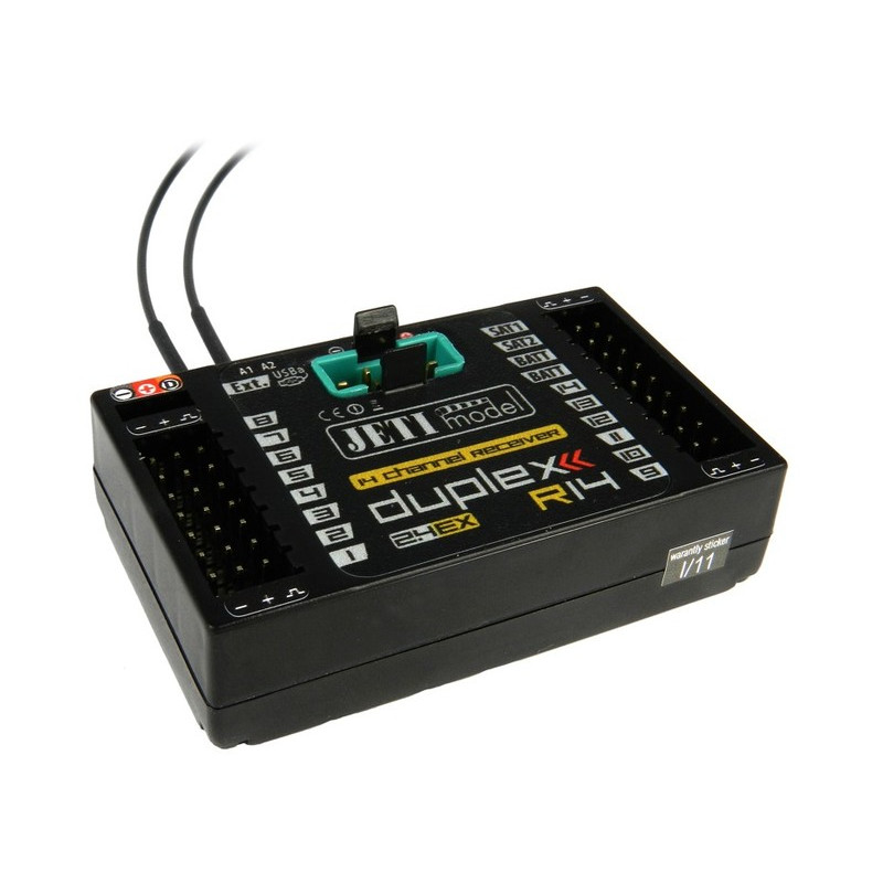 14kanálový modelářský přijímač DUPLEX R14 pracující v pásmu 2,4 GHz - kompatibilní s moduly DUPLEX, od renomované české společnosti JetiModel. Díky jednoduchému programování a párování, kompaktním rozměrům, nízké hmotnosti a možnosti sériového propojení dvou a více přijímačů do jednoho, jakož i možnosti plnohodnotného programování mixážních a kanálových funkcí (díky volitelnému modulu Jeti BOX) je Duplex R14 jedním z nejuniverzálnějších přijímačů na trhu. Kromě toho namontované volitelné telemetrické senzory, které přenášejí "živé" informace z modelu do vysílače prostřednictvím přijímače, dále zvyšují hodnotu výrobku.