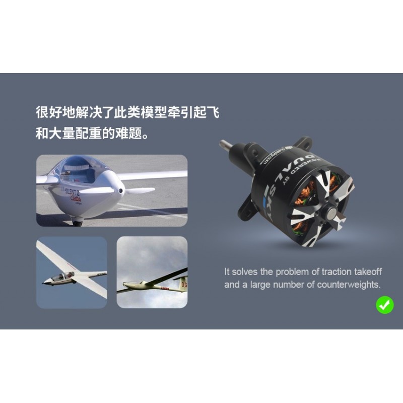 Kolébka s vestavěným ložiskem umožňuje použití DUALSKY Dualsky (jakož i s rotačním pláštěm od jiných výrobců s hřídelí o průměru 6 mm a rozteči montážních otvorů 25/25 mm), v těsných a úzkých trupech, např kluzáků. Délka postele ve většině případů umožňuje, aby byl motor namontován dostatečně daleko od úzkého přídě modelu, takže je k dispozici dostatek místa pro jeho bezpečné připevnění a vedení kabelů lze volně vést.