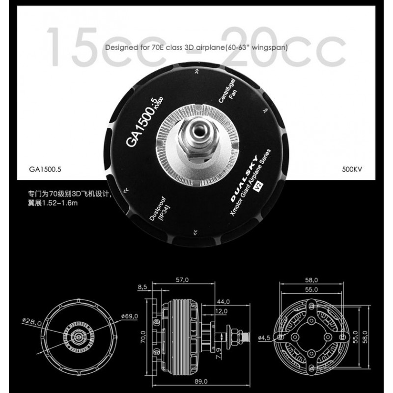Špičková řada elektromotorů od Dualsky navržená pro velké modely. GA1500.5 je určen pro modely s hmotností do 4,5 kg nebo modely 3D akrobat s hmotností do 3,0 kg. Náhrada za benzínové motory 15-20 cm 3