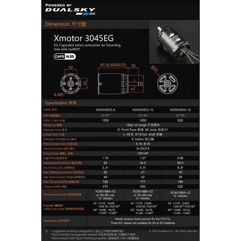 XM3045EG je řada 12pólových elektromotorů Dualsky určených pro modely kluzáků s úzkým trupem, jako je F5J, vyznačující se vysokým točivým momentem a výkonem. Absence rotujícího rotoru a kabely vedoucí ze zadní části motoru umožňují snadnou a bezpečnou instalaci do úzkého trupu bez rizika přeříznutí kabelů. Motor je vybaven robustní a zároveň lehkou dutou hřídelí o průměru 5 mm. Pro maximalizaci životnosti jsou použita velká, robustní a nárazuvzdorná ložiska NMB.