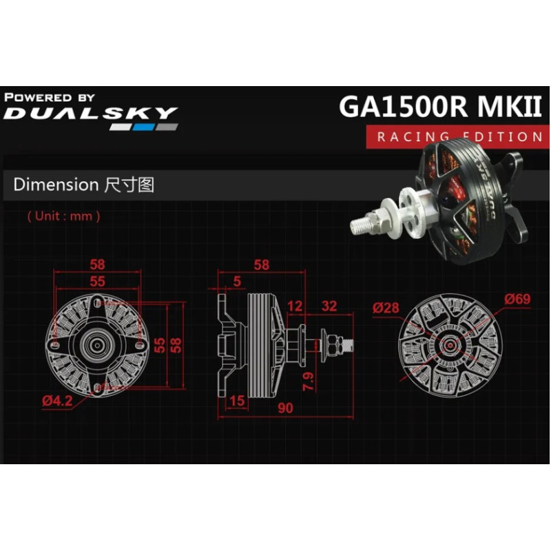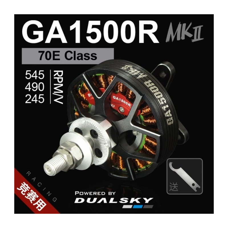 Špičková řada elektromotorů Dualsky pro velké modely. GA1500R MkII Racing Edition je vylepšený motor vycházející ze standardní řady motorů GA pro modely třídy 70-80E , rozpětí 60-64″ a hmotnosti do 7,0 kg nebo 3D kaskadérské modely s hmotností do 3,3 kg.