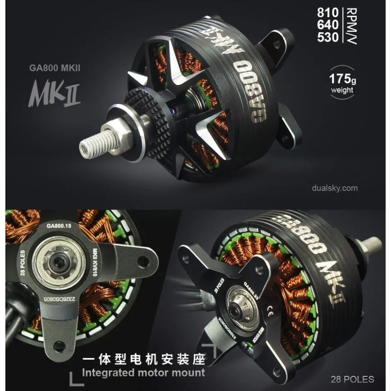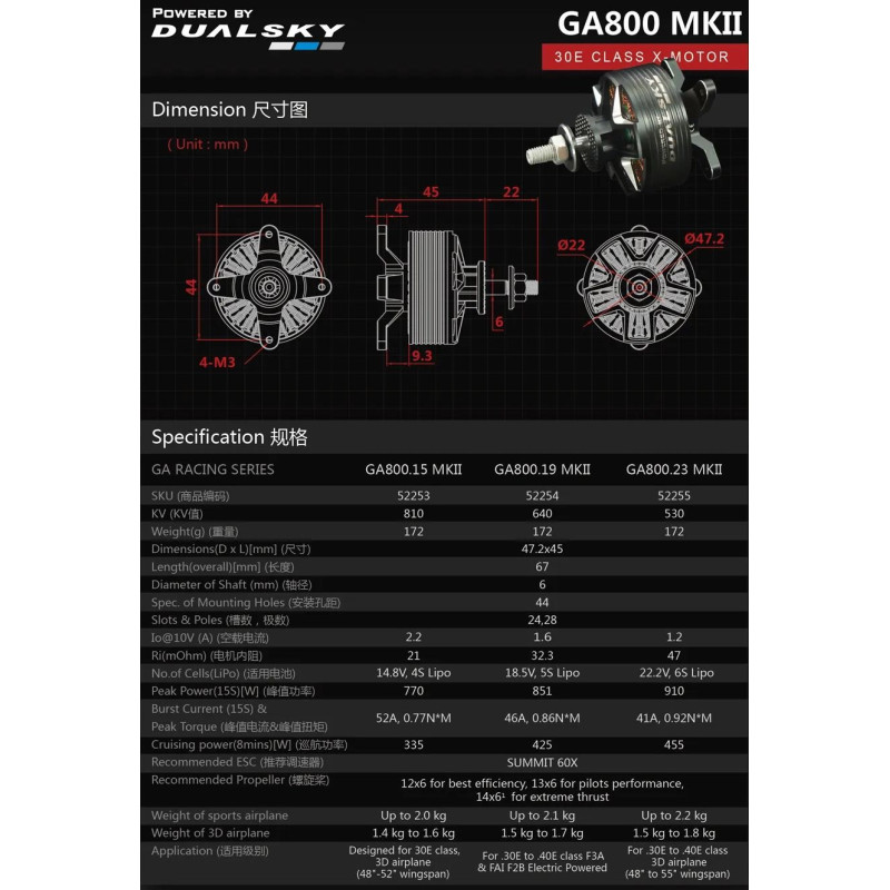 Špičková řada elektromotorů Dualsky. GA800.19 MkII je určen pro modely třídy 30E/40E F3A a F2B s hmotností do 2,1 kg nebo 3D akrobatické modely s hmotností do 1,5 až 1,7 kg.