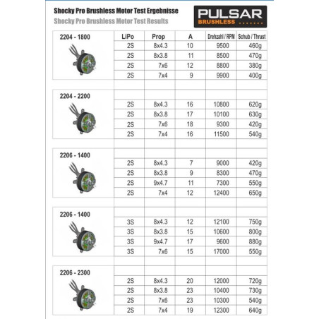 Motory Shocky Pro jsou k dispozici v různých verzích a jsou obecně vhodné pro malé modely letadel. Umožňují vysoký letový výkon ve 3D se vzletovou hmotností do přibližně 300 g. Motory mají integrované čtyřbodové uchycení a lze je přišroubovat přímo k motorové přepážce. Motor je vhodný pro použití s 2S nebo 3S LiPo akumulátory.