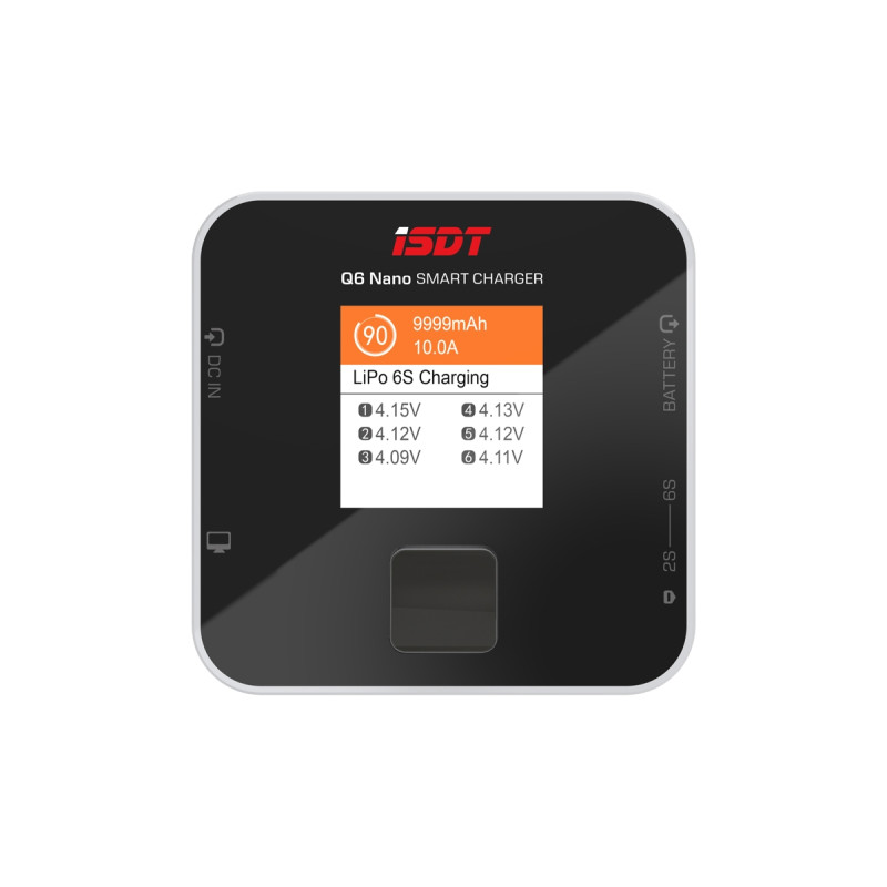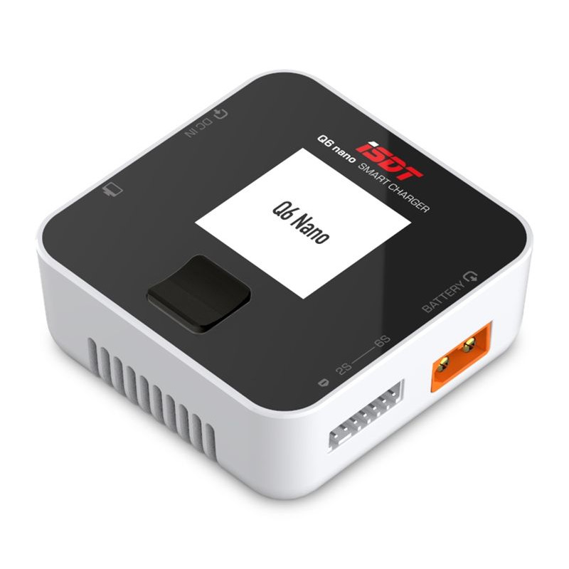 Miniaturní nabíječka ISDT Q6 Nano 200W je inteligentní nabíječka s napájením z autobaterie nebo stabilizovaného síťového zdroje a velmi jednoduchým a přehledným ovládáním. Q6 Nano je schopna nabíjet a vybíjet běžné typy článků (NiCd, NiMH, LiPo, LiHV, ULiHV, Li-ion, LiFe, Pb) a je také vybavena vestavěným šestikanálovým balancerem pro zajištění bezpečného nabíjení lithiových baterií. Nabíječka je vybavena barevným LCD displejem a třípolohovým programovacím tlačítkem, které zajistí pohodlné a velmi přehledné nastavení parametrů, kontrolu a sledování procesu nabíjení/vybíjení.