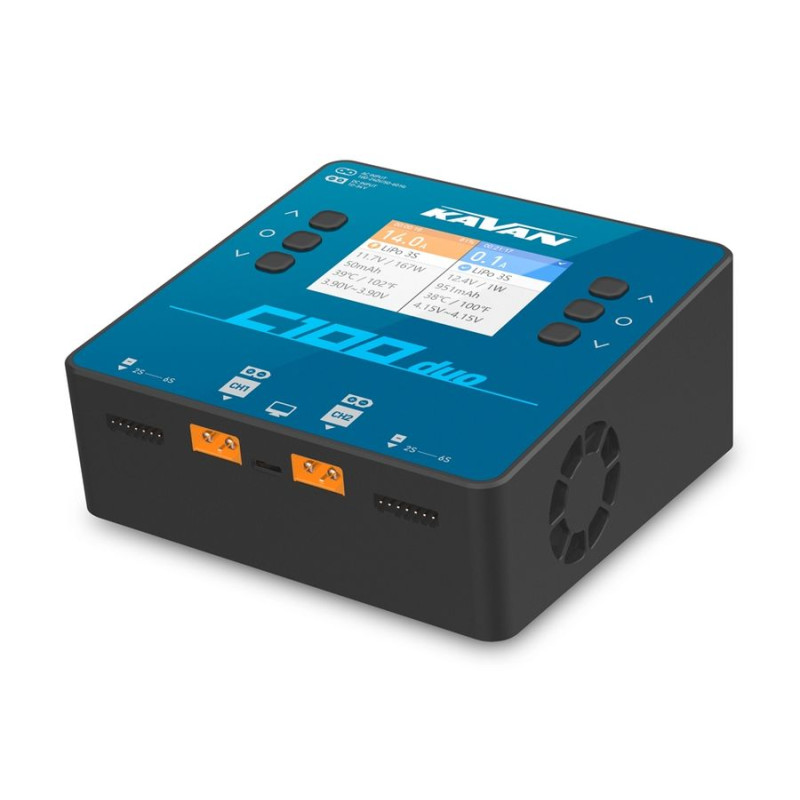 Malá dvoukanálová nabíječka KAVAN C100 Duo 2x500 W byla navržena tak, aby nabízela vysokokapacitní inteligentní nabíječku s napájením ze sítě i z autobaterie a velmi jednoduchým a přehledným ovládáním. Model C100 Duo je schopen nabíjet a vybíjet oblíbené typy článků (NiCd, NiMH, LiPo, LiHV, ULiHV, Li-ion, LiFe, Pb) a je také vybaven vestavěným šestikanálovým balancérem pro zajištění bezpečného nabíjení lithiových baterií. Nabíječka je vybavena barevným LCD displejem a programovacími tlačítky, která zajistí pohodlné a velmi přehledné nastavení parametrů, kontrolu a sledování procesu nabíjení/vybíjení.