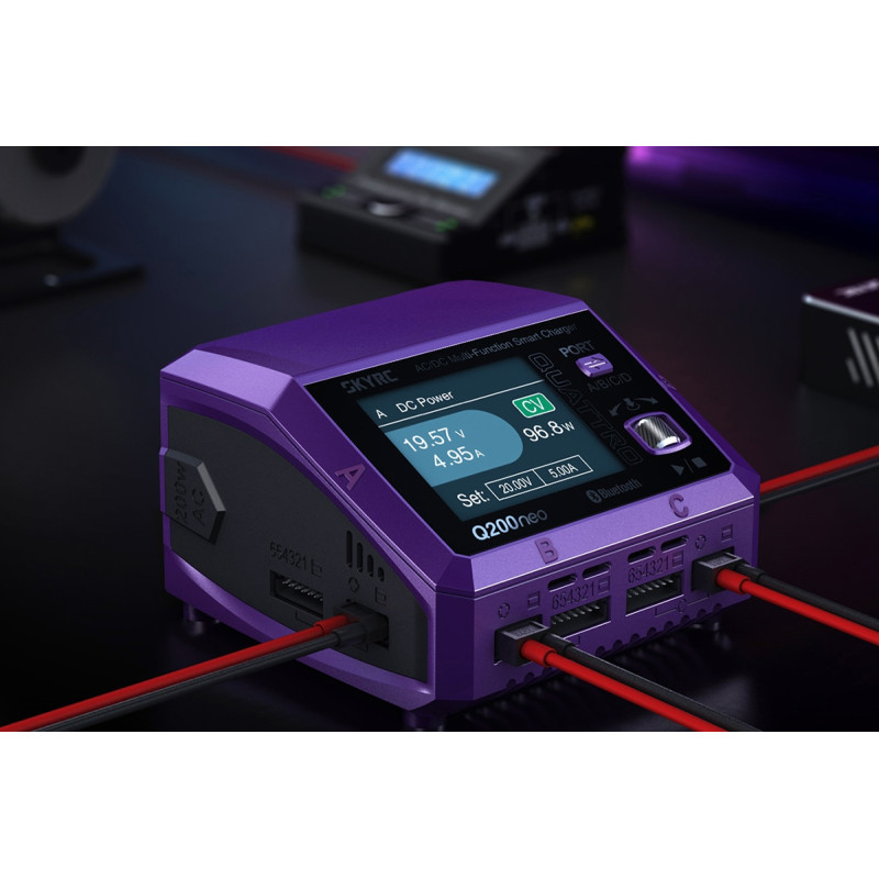 Čtyřkanálová nabíječka SKY RC Q200neo 400 W je navržena tak, aby poskytovala vše potřebné pro současné nabíjení čtyř akumulátorů proudem "pod jednou střechou", včetně síťového napájení, s jednoduchou obsluhou a možností komunikace s aplikací SkyCharger. Q200neo umožňuje nabíjení a vybíjení oblíbených typů článků (NiCd, NiMH, Li-poly, Li-ion, Li-Fe, Li-HV, Pb), navíc jsou všechny kanály vybaveny vestavěnými šestikanálovými balancéry pro pohodlné nabíjení lithiových baterií.