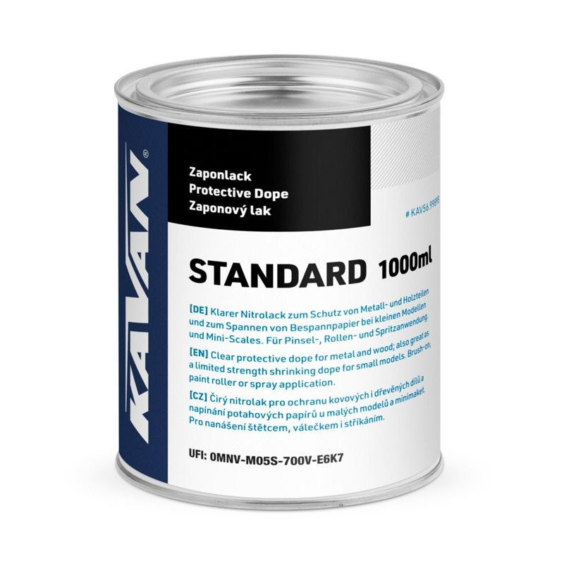 Návod k použití. Nanášejte 2-4 vrstvy; vždy nechte lak zaschnout alespoň 24 hodin a přebruste jemným brusným papírem zrnitosti 600-1000. Při použití na modelu se spalovacím motorem použijte vrchní lak odolný proti palivu (např. krycí lak KAV56.9990 KAVAN POLY, bezbarvý lak ve spreji 5MA4401 RC Color).