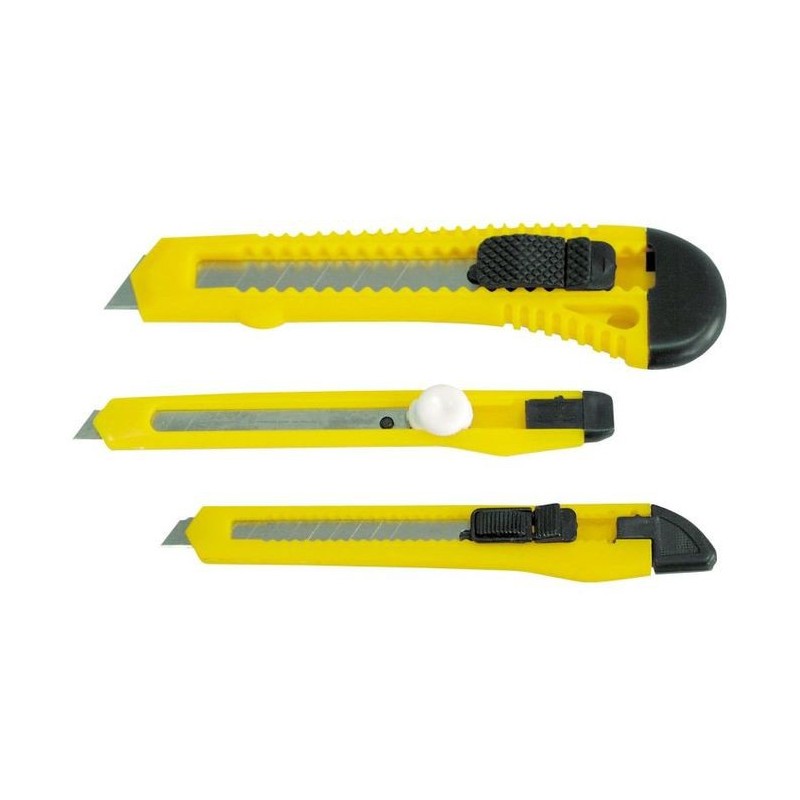 Sada 3 nožů s výsuvnými a lámavými čepelemi. Plastová těla s uzamykatelnými čepelemi