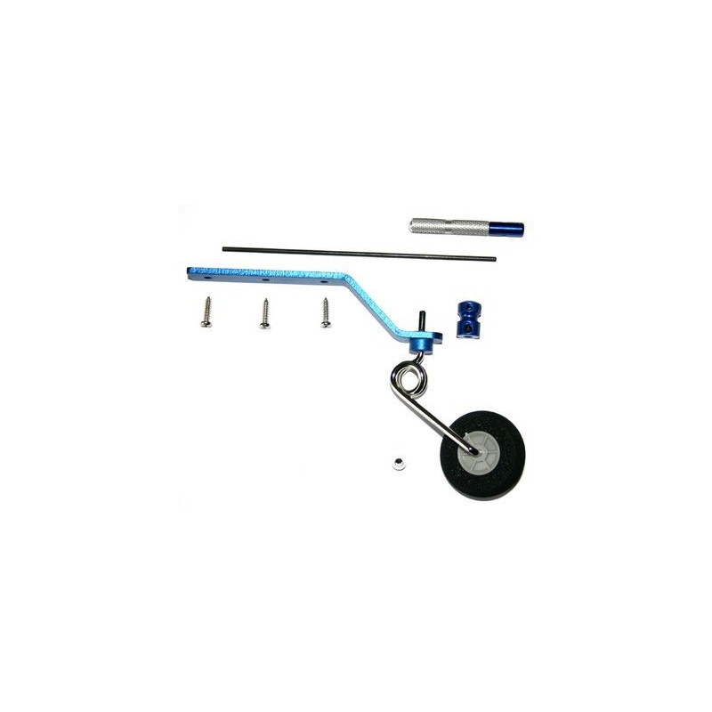 Duralový, odolný a lehký zadní podvozek pro létající modely. Kolo je řízeno spojením páky kola s kormidlem pomocí ocelového posunovače. 35mm pěnové kolo.