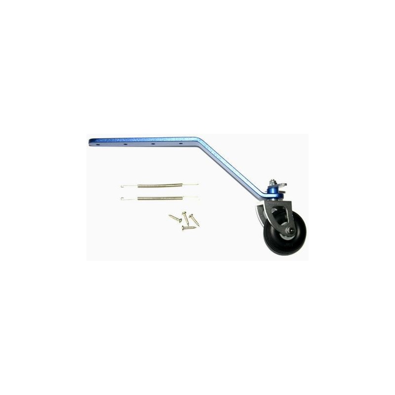 Duralový, odolný a lehký zadní podvozek pro létající modely. Kolo je řízeno spojením páky kola s kormidlem pomocí pružin.