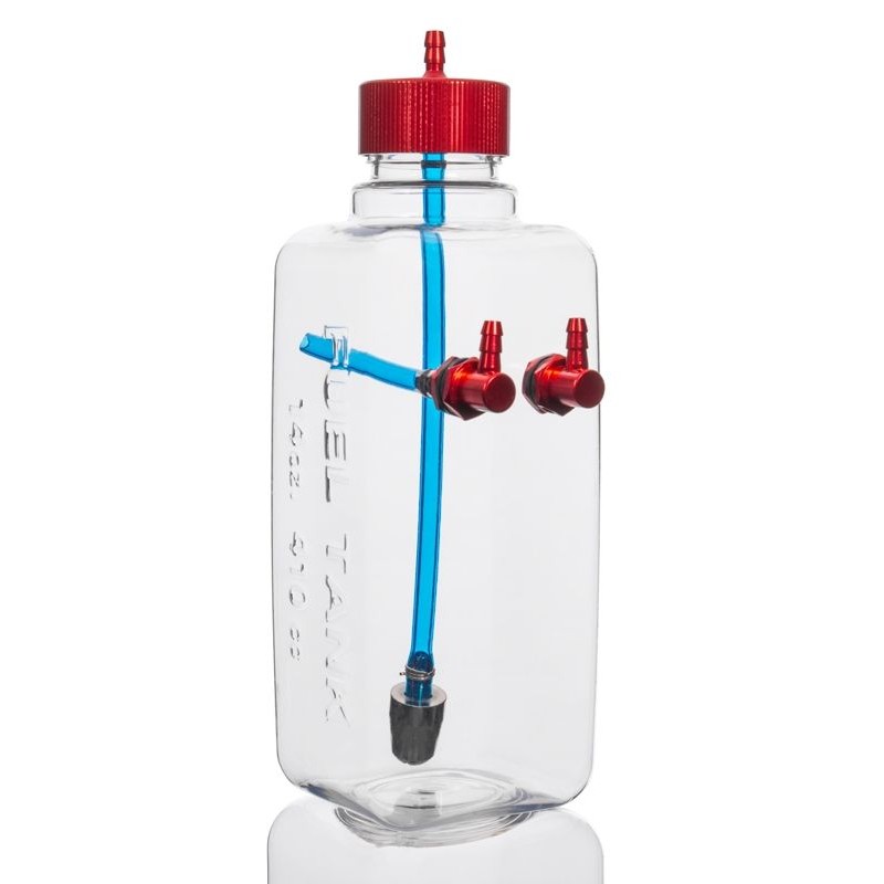 Palivová nádrž FlowMaster je vyrobena z vysoce pevného čirého plastu pro benzín. Eloxovaná hliníková zátka s integrovanou sací hubicí, mosazným kováním a hmotností.