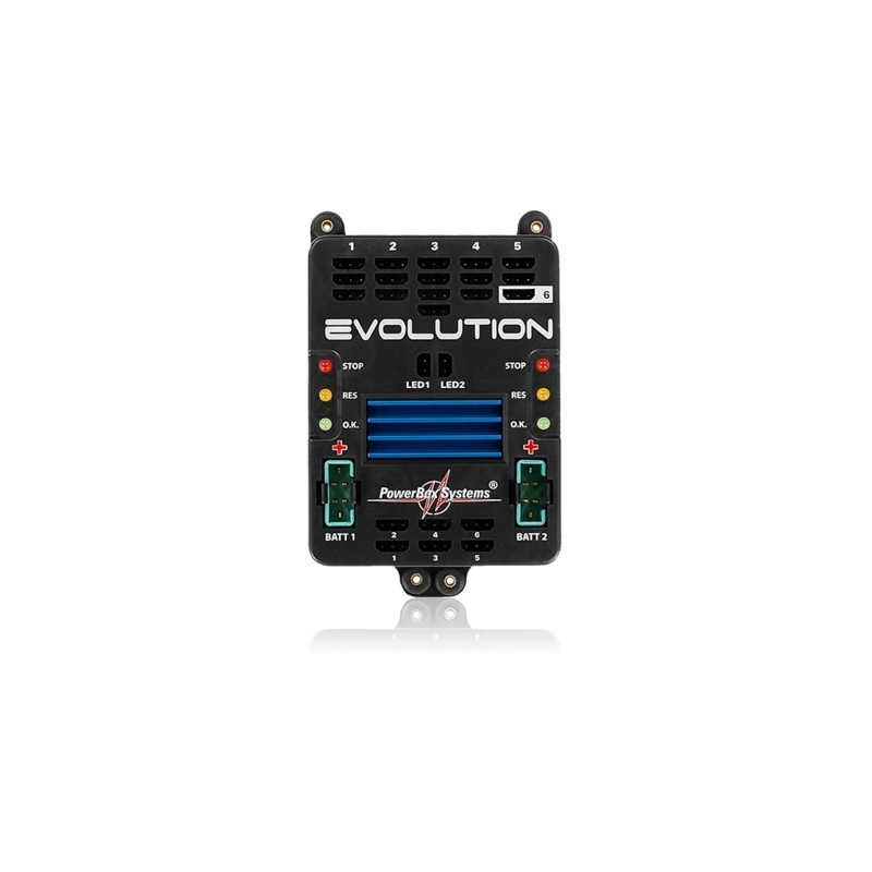 PowerBox Evolution je malý, solidní napájecí systém, perfektní jako první zařízení PowerBox. Rozsah aplikací sahá od modelů warbirdů, 3D akrobacie až po trysky. První řada Evolution byla uvedena na trh již v roce 2004 a od té doby se neustále vyvíjí a vylepšuje. Například aktuální verze poskytuje vzdálený přístup k šesti kanálům. Účinnost regulátorů byla také významně zvýšena přepracováním celé základní desky. Výstupní napětí lze konfigurovat na 5,9 V nebo 7,4 V, což z PowerBoxu Evolution dělá skvělou volbu pro standardní serva 6,0 V. V obou případech zajišťuje konstantní výstupní napětí nepřetržitý chod serva. Zařízení se zapíná pomocí SensorSwitch, který je součástí sady. Postup je jednoduchý: stisknutím tlačítka SET připravíte spínací proces, poté krátkým stisknutím tlačítek I a II aktivujete oba výkonové obvody. To účinně eliminuje riziko náhodného vypnutí. SensorSwitch se také používá k nastavení typu baterie. Tato informace je nezbytná pro integrovaný indikátor napětí. Dvě řady LED diod indikují stav nabití baterií ve čtyřech stupních. Pamatuje se také paměť minimálního napětí, ke kterému dochází během letu, což umožňuje pilotovi přesněji sledovat baterie. Po letu lze minimální hodnotu odečíst z LED pomocí tlačítek I a II. PowerBox Evolution je vybaven integrovaným zesilovačem signálu, který zajišťuje dostatečnou sílu signálu pro serva. To je perfektní při použití dlouhých prodlužovacích kabelů. Zařízení je také vybaveno systémem, který potlačuje možné zpětné proudy serva.