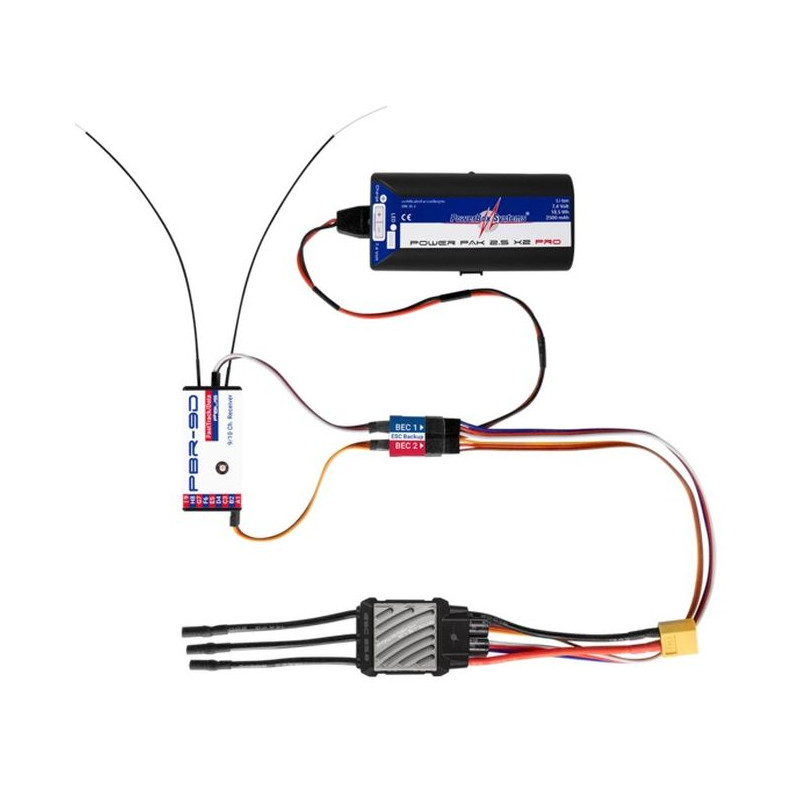 ESC Backup umožňuje uživateli vytvořit spolehlivé, redundantní napájení přijímače pomocí stávajícího zdroje BEC regulátoru otáček a pomocné baterie. ESC Backup má dva vstupy z regulátoru otáček: jeden pro výstup PWM, druhý pro telemetrii - pokud je přítomna.