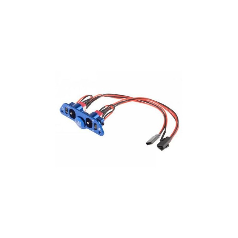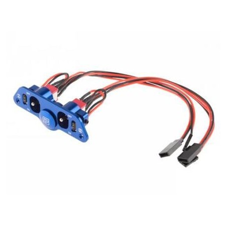 Dva nezávislé spínače s jednotlivými zásuvkami v jednom krytu. Přepínač je určen pro spalovací modely, zejména pro modely s velkými žhavicími motory a benzínovými motory. Kabely se zástrčkami JR a zásuvkami JR / FUTABA. Hliníkové pouzdro.