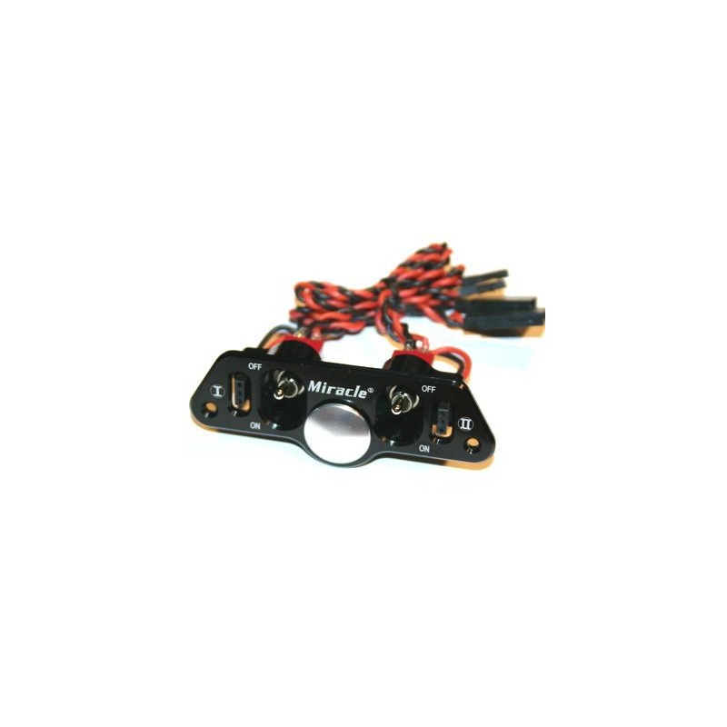 Dva nezávislé silnoproudé jističe Miracle se dvěma nabíjecími zásuvkami a palivovou náplní v jednom krytu. Přepínač je určen pro spalovací modely, zejména pro modely s velkými žhavicími motory a benzínovými motory. Kabely 22AWG se zástrčkami a zásuvkami JR. Černý eloxovaný hliníkový kryt.