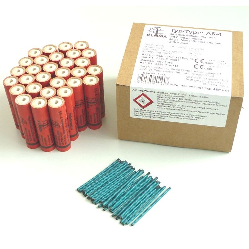 Raketový motor A6-4 pro raketové modely německé společnosti Raketenmodellbau Klima GmbH, která se specializuje na výrobu raketových motorů a raket.