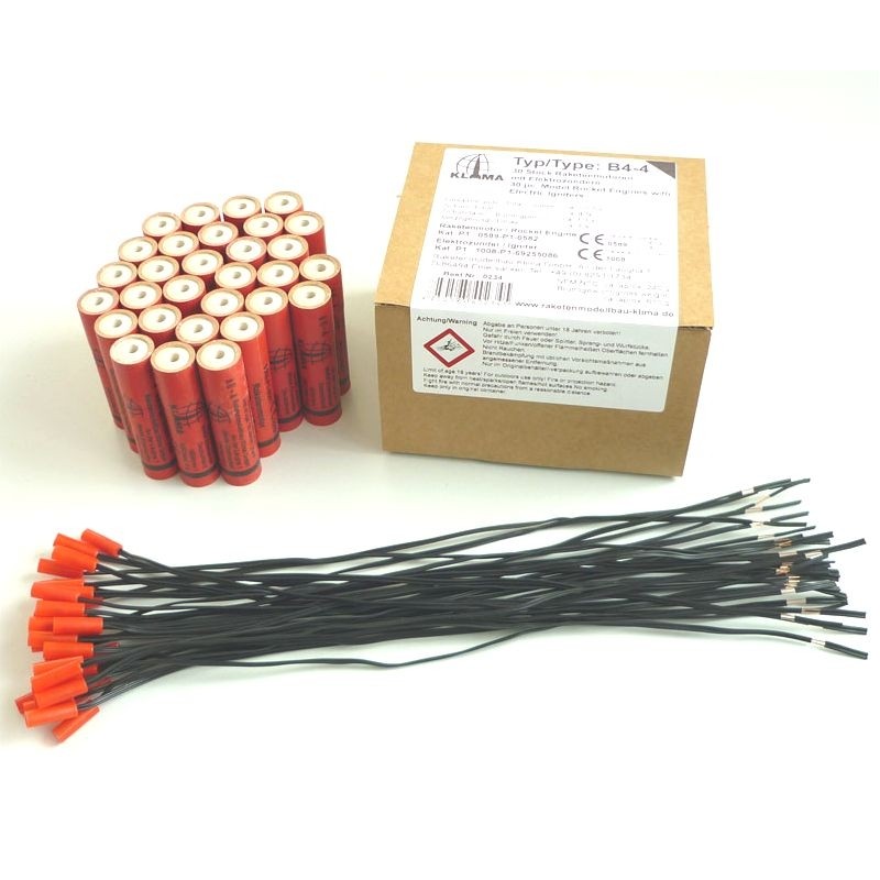Raketový motor B4-4 pro raketové modely německé společnosti Raketenmodellbau Klima GmbH, která se specializuje na výrobu raketových motorů a raket.