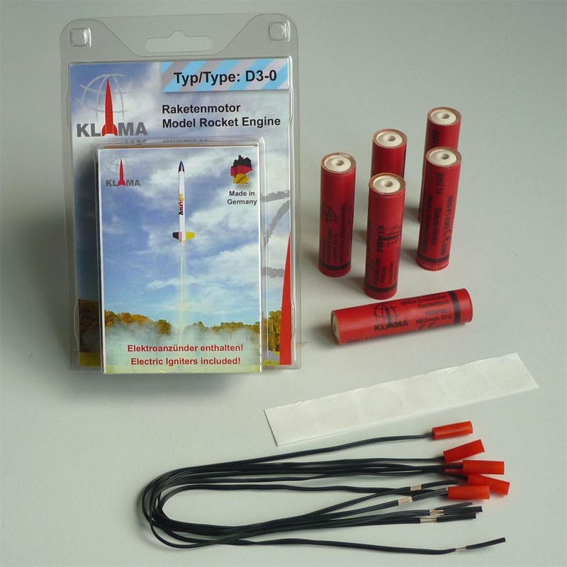 Raketový motor D3-0 pro raketové modely německé společnosti Raketenmodellbau Klima GmbH, která se specializuje na výrobu raketových motorů a raket.