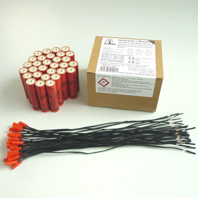 Sada motorů pro raketové modely německé společnosti Raketenmodellbau Klima GmbH, která se specializuje na výrobu raketových motorů a raket.