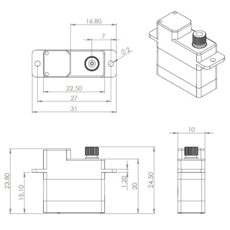 Velmi výkonný a rychlý, programovatelný, tenký digitální mikromotor s kovovými převody a výstupní hřídelí uloženou na dvou jehlových ložiskách a jednom samomazném ložisku. Díky plochému pouzdru o výšce 10 mm je vhodný zejména pro ovládání křidélek a klapek v RC vrtulnících, menších větroních a motorových modelech