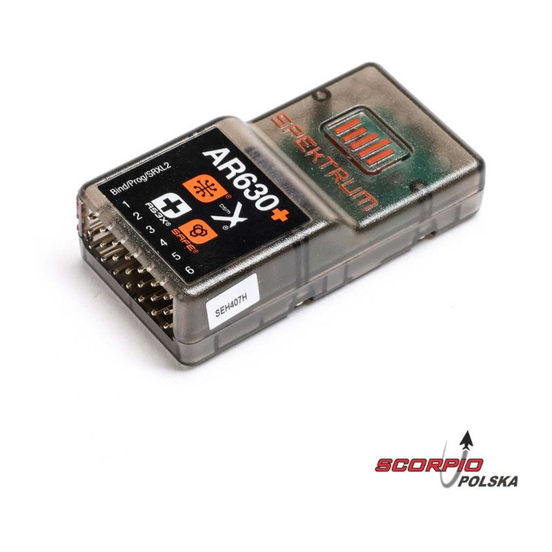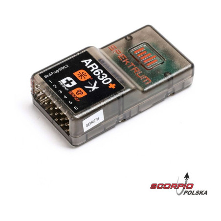 RC přijímač Spektrum AR630+ je kompatibilní se systémem Spektrum SMART a inteligentním telemetrickým přenosem. Jeho výhodou je vestavěná nová stabilizace AS3X+, která koriguje účinky větru a turbulencí pomocí tříosého gyroskopu MEMS a exkluzivního softwaru, a funkce SAFE pro řízení letu. Kompaktní velikost přijímače s vestavěnou anténou v krytu. Podpora nové funkce stahování nastavení z přijímače (Smart Transmitter Model Files).