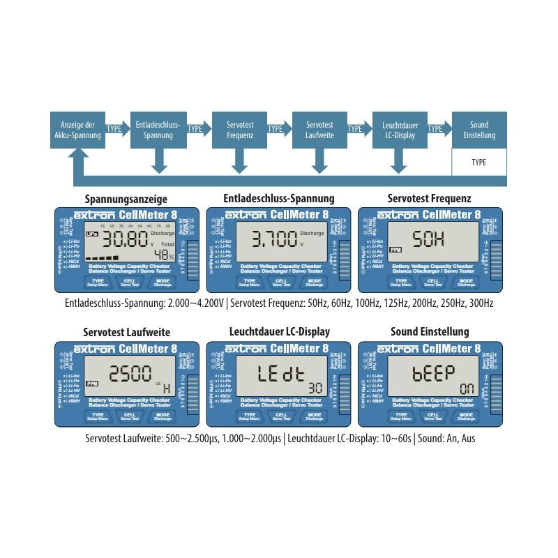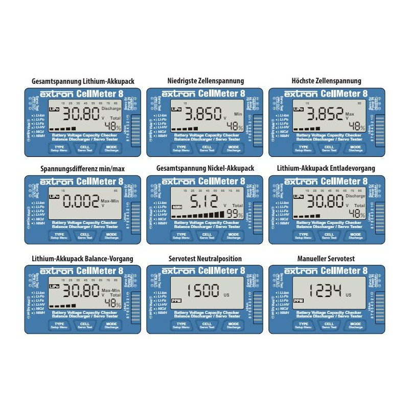 Cell Meter 8 je multifunkční měřicí přístroj, který lze použít k měření baterií (také napětí jednotlivých článků). Cell Meter 8 navíc dokáže vyvažovat lithiové baterie a testovat servořízení.