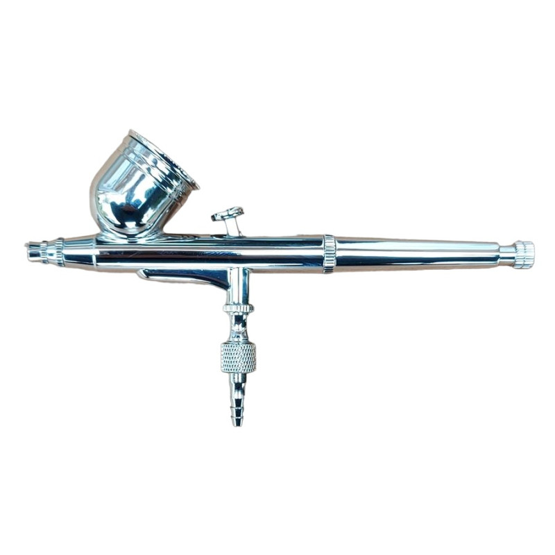 Jedná se o dvoufunkční airbrush, což znamená, že pomocí tlačítka nastavíte jak množství přiváděného vzduchu (pohyby nahoru a dolů), tak množství barvy (pohyby dozadu a dopředu).