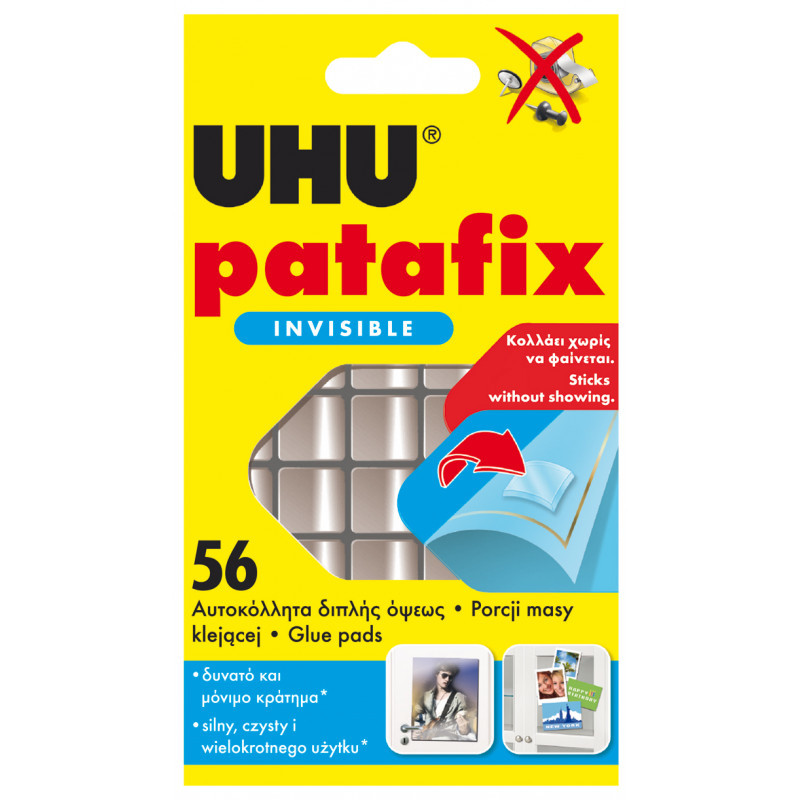 UHU Patafix - opakovaně použitelná lepicí hmota, 56 porcí. UHU Patafix - chytrá alternativa ke špendlíkům, páskám a hřebíkům! UHU Patafix je snímatelná, opakovaně použitelná lepicí hmota pro rychlé a čisté upevnění drobných předmětů, jako jsou fotografie, pohlednice, kresby, plakáty atd., na různé povrchy, jako jsou stěny, dveře nebo nábytek. tisíce způsobů použití doma, ve škole nebo v kanceláři.