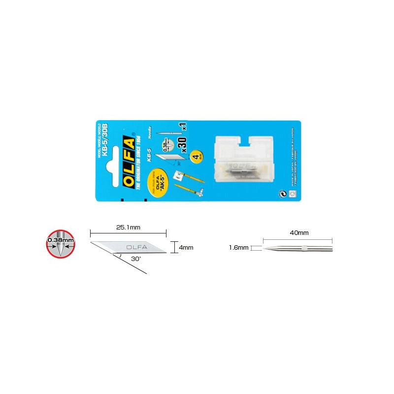 Čepel pro skalpel AK-5. Geometrie čepele umožňuje uživateli pohodlně sledovat dráhu řezu a její malý úhel hrotu umožňuje přesné řezání i těch nejmenších částí.
