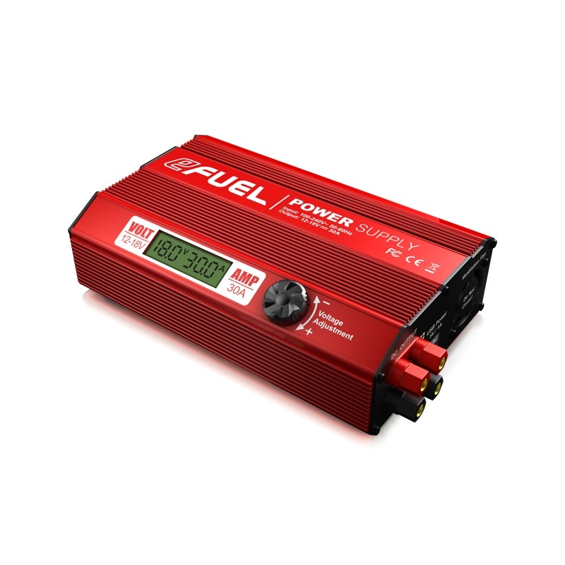 Model zdroje eFuel má pohodlný knoflík pro regulaci napětí v rozsahu 12 - 18 V. Na druhou stranu čitelný LCD displej zobrazuje aktuální výstupní napětí a proud, což značně usnadňuje provoz zdroje. Univerzální napájecí zdroj AC 100 - 240 V znamená, že zdroj lze používat po celém světě bez potřeby síťových adaptérů.