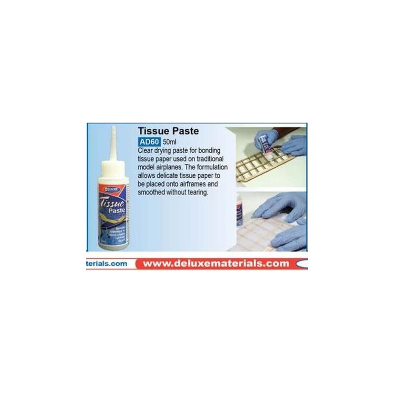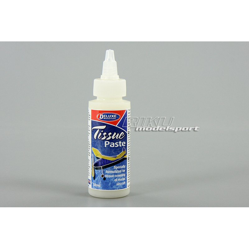 Transparent drying paste for bonding tissue paper used on traditional model airplanes. The formula allows the fine tissue paper to be applied to the ribbing and smoothed without tearing.