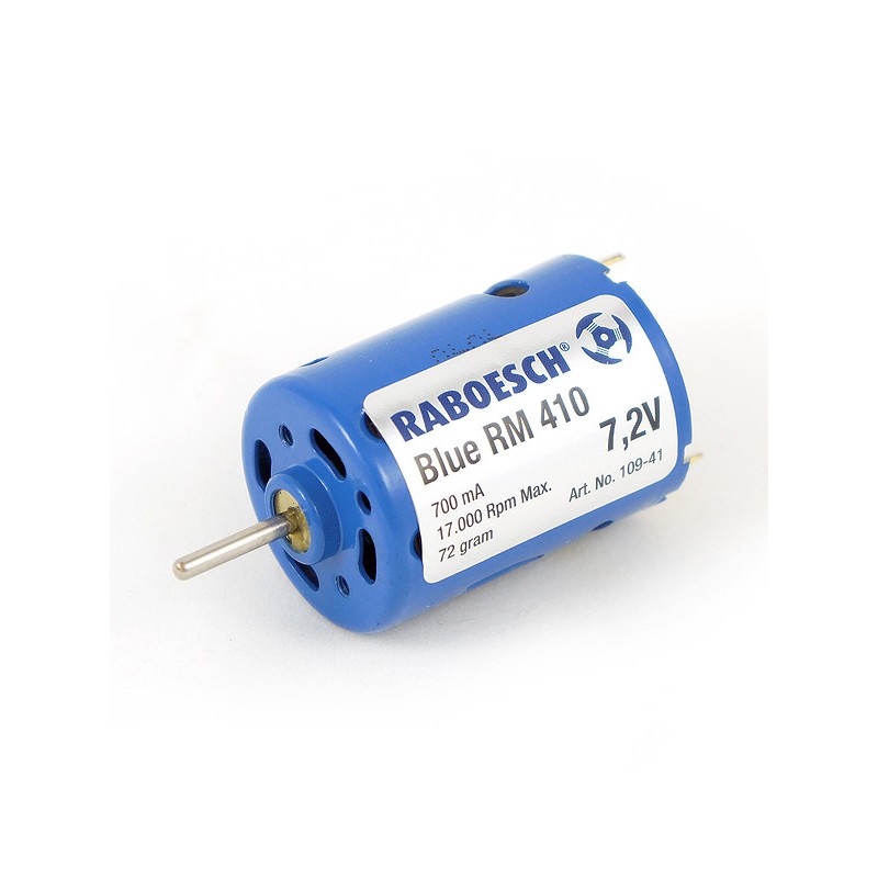 Blue RM410 7.2V brushed electric motor manufactured by the Dutch company RABOESCH.