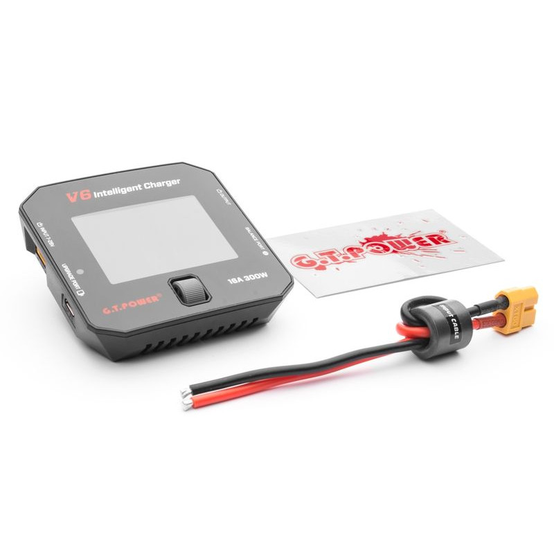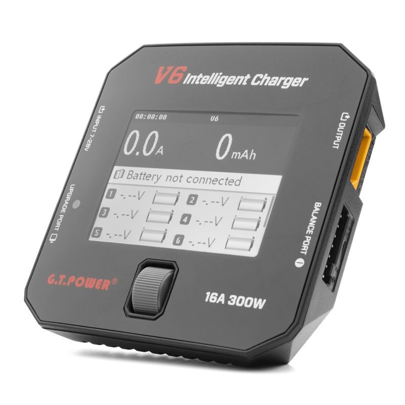 The GT POWER V6 300W charger is designed to offer a smart pocket charger with great performance and very simple and clear operation. The V6 is capable of charging and discharging popular cell types (NiCd, NiMH, LiPo, LiHV, Li-ion, LiFe, Pb), plus it has a built-in six-channel balancer for very safe and convenient charging of lithium batteries.