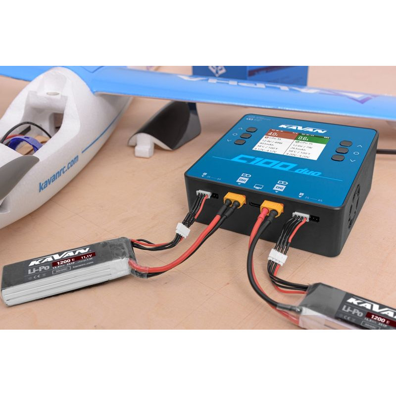 The KAVAN C100 Duo 2x500W small dual-channel charger is designed to offer a high-performance smart charger with mains and car battery power and very simple and clear operation. The C100 Duo is capable of charging and discharging popular cell types (NiCd, NiMH, LiPo, LiHV, ULiHV, Li-ion, LiFe, Pb), and is also equipped with built-in six-channel balancers to ensure safe charging of lithium batteries. The charger is equipped with a color LCD display and programming buttons, which will provide you with a convenient and very clear way to set parameters, control and monitor the charging/discharging process.