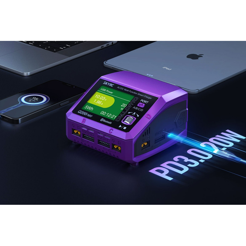 The SKY RC Q200neo 400W four-channel charger is designed to provide everything needed to simultaneously charge four batteries with currents "under one roof", including mains power, with simple operation and the ability to communicate with the SkyCharger app. The Q200neo allows charging and discharging of popular cell types (NiCd, NiMH, Li-poly, Li-ion, Li-Fe, Li-HV, Pb), in addition, all channels are equipped with built-in six-channel balancers for convenient charging of lithium batteries.