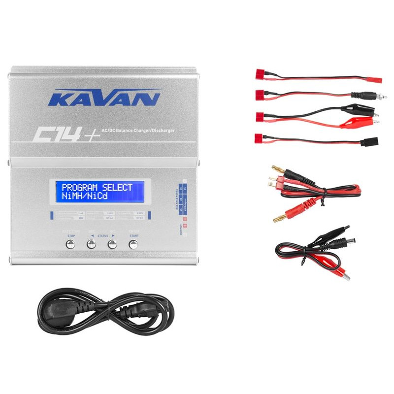 The charger kit includes: charger KAVAN C14+, mains cable, 12 V power cable with crocodiles, Dean-T charging cable with adapters for JST-BEC, JR/Futaba, with crocodiles and for compact glow plugs, instructions.