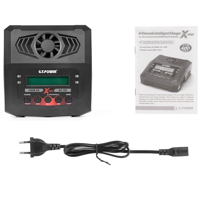 The GT POWER X4 mini 4x100W four-channel charger is designed to provide everything you need to charge as many as four batteries simultaneously "under one roof", including an AC power source and with simple operation.