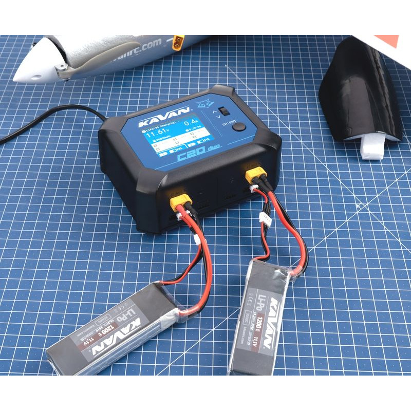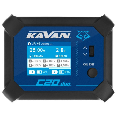 KAVAN C20 Duo small dual-channel charger is a smart AC/DC charger with very simple and intuitive operation. KAVAN C20 Duo is capable of charging popular battery types (NiCd, NiMH, LiPo, LiHV, ULiHV, Li-ion, LiFe, lead-acid), and is additionally equipped with built-in six-channel balancers to ensure safe charging of lithium batteries. The charger features a color LCD display and a programming knob and button for convenient and quick parameter setting, control and monitoring of the charging process.
