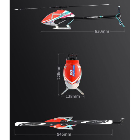 Let's take a closer look at this latest acquisition of the OMP Hobby hangar. The basis of the fuselage structure is a pair of carbon sidewalls connected by baffles made of duralumin and plastic. "The heart" is a duralumin structure that houses a SUNNYSKY R80-7 AC motor with an attached main shaft housing with bearings and circulation plate servo mounts. The balancing rotor is driven by a 5mm wide toothed belt. The rotor plate and rotor head with blade hardware are CNC-machined metal. All control rods are equipped with screws that allow fine adjustment of rod length without removing ball studs. The rear girder is made of carbon pipe, the vertical stabilizer and sides of the balancing rotor drive housing are also carbon fiber. The head and blades of the leveling rotor are made entirely of metal. The yaw is controlled by a servo located at the bottom of the fuselage using a carbon rod. The housing is made of durable fiberglass-reinforced plastic.