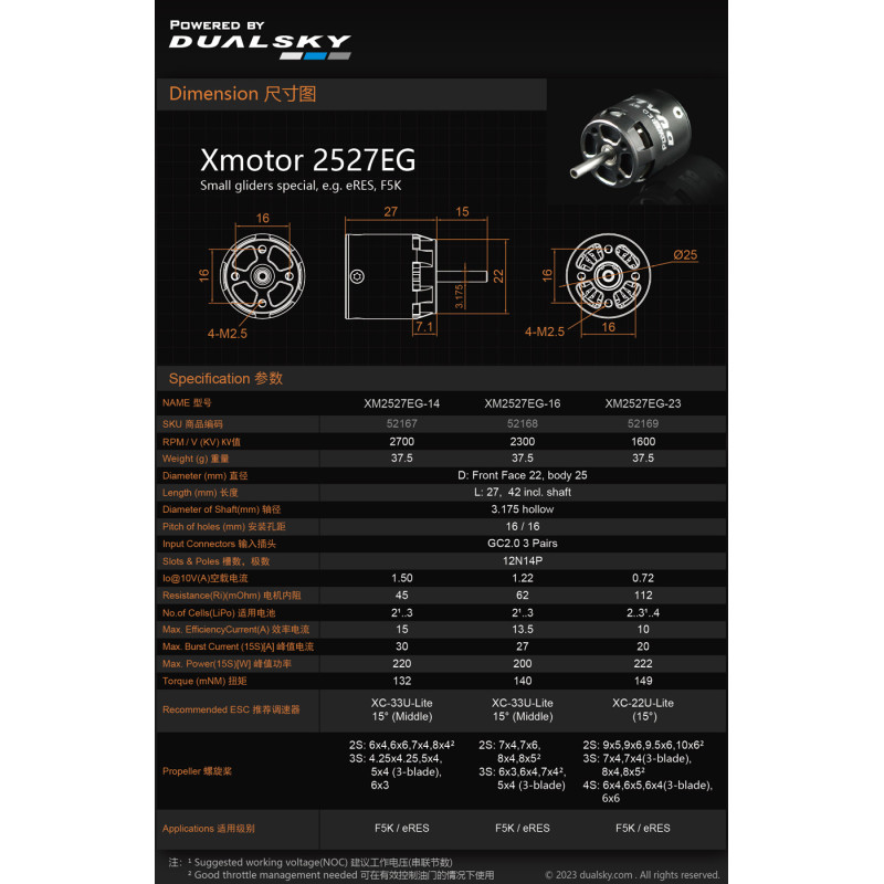 The XM2527EG is Dualsky's line of 14-field 25mm diameter electric motors, designed for small glider models with narrow fuselages, such as the F5J, with a bow trimmed for a 25-32mm cap. Strongly openwork front of the motor and rotor with fan using the "turbo" cap provide excellent cooling. The lack of a rotating rotor and the cables leading out of the rear of the motor allow easy and safe installation in a tight fuselage without the risk of cutting the cables. The motor features a 3,175mm diameter hollow shaft. The motor uses heavy-duty, high-speed NMB bearings.