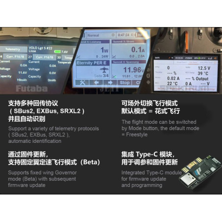Supports multiple telemetry protocols (SBus2, EXBus, SRXL2), automatic identification. Featuresan integrated USB-C port for firmware updates and programming.