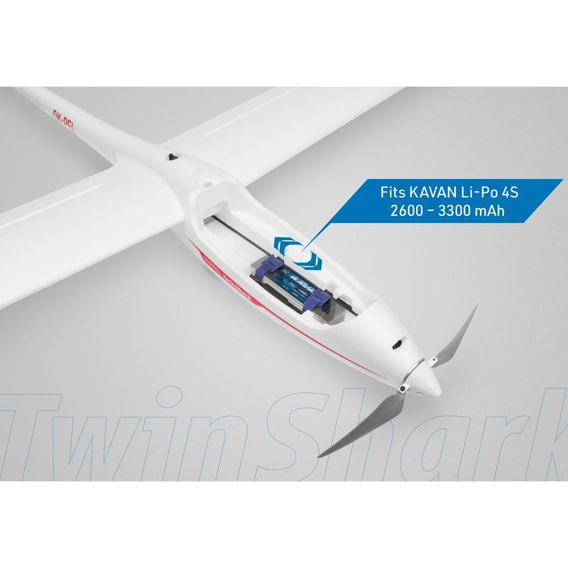 The fuselage of the model is made of highly resistant EPO (extruded polyolefin) foam with thorough internal carbon reinforcements. A C3548-750 AC electric motor with 11x8" folding propeller and a KAVAN R-50SB regulator with a powerful BEC power stabilizer needed to power the 6 servos on board are mounted on the bow. The cabin cover is removable, attached with a pin at the front and a magnet at the rear. On the bow you will find enough space for the propulsion battery and receiver.
